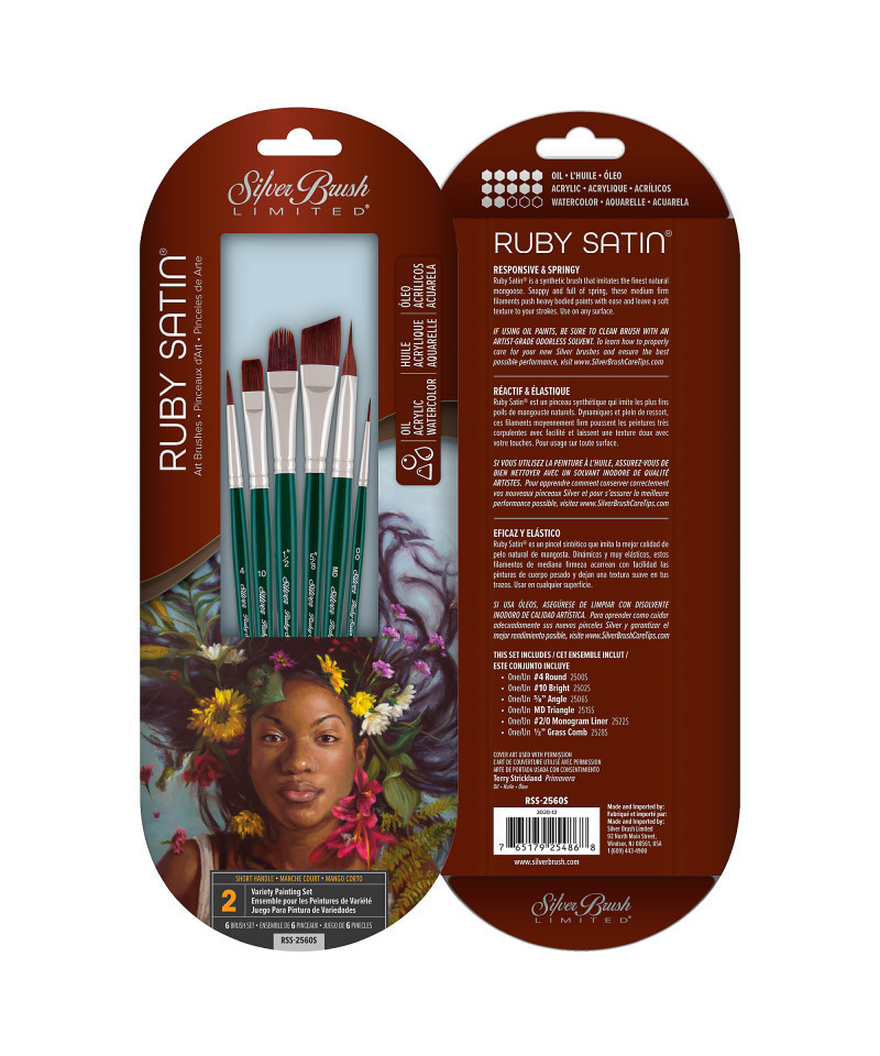 Silver Brush Ruby Satin line was created for artists who use a variety of paint types. Each brush is designed with synthetic-fiber tips that imitate mongoose. They are durable and firm enough to carry heavy liquids yet make smooth strokes. Silver Brush Ruby Satin professional artist brushes are expertly crafted with synthetic-mongoose filament and are fit for rough painting surfaces. Each brush has a short handle that is finished with a sophisticated nickel-plated brass ferrule. This Ruby Satin brush kit includes round, triangle, angled, Bright, monogram liner, and filbert comb brushes. This is the perfect brush set to create broad strokes, abstracts, crisp detail, signatures, and botanical or textured designs. Each Ruby Satin synthetic brush can be paired with heavy-bodied acrylic or oil paint. These professional paintbrushes also work well with watercolor and gouache, proving they are extremely versatile. Enjoy the smooth, colorful strokes. Silver Brush Ltd is owned by a 4th generation art materials family and proud of Silver Brush rich heritage in bringing quality supplies to artists and craftsmen throughout the world. We delight in challenging the status quo and putting Silver Brush experience to work for you because Art is for Everyone!