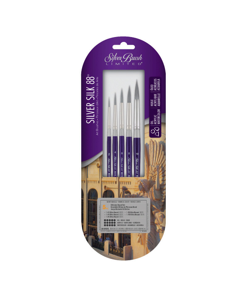 Each brush in Silver Brush Silver Silk line is designed with synthetic fiber tips except for Silver Brush Mini Mop, which is made with dressed white goat hair. Silver Brush durable Silver Silk brushes exhibit maximum color absorbency and control. Silver Brush Silver Silk professional artist brushes are made with superior Silver Taklon synthetic filament or white goat hair and display exceptional wear resistance. Each artist painting brush has a handle that is sophisticatedly finished with lacquer. Includes 1 #2 Ultra Round, 1 #4 Ultra Round, 1 #6 Ultra Round, 1 #8 Ultra Round, and 1 #10 Ultra Round Brush. Each Silver Silk goat hair or synthetic brush can be paired with fluid and interference acrylic or gouache. These paintbrushes also work well with watercolor, inks, dyes, and heavy body paint, proving that they are extremely versatile. Enjoy the controlled, colorful strokes. Silver Brush Ltd is owned by a 4th generation art materials family and proud of Silver Brush rich heritage in bringing quality supplies to artists and craftsmen throughout the world. We delight in challenging the status quo and putting Silver Brush experience to work for you because Art is for Everyone!