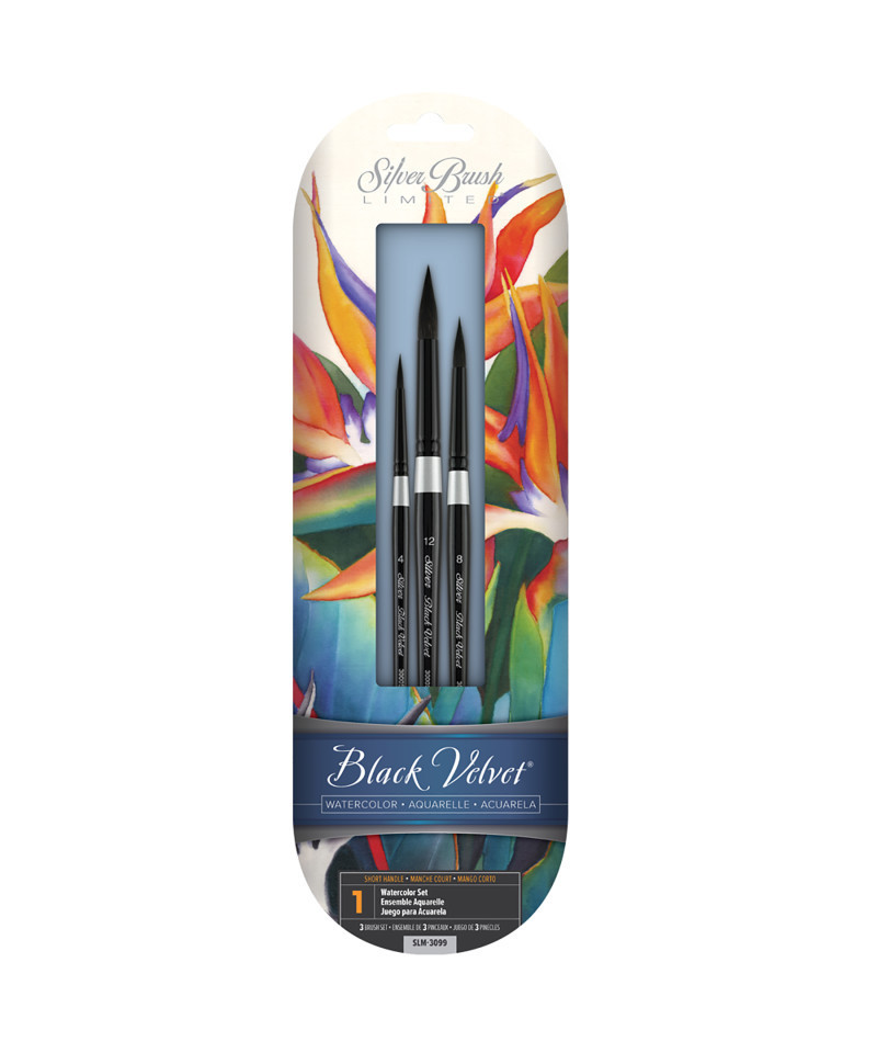 Silver Brush Black Velvet brushes were created for watercolor artists and skilled hobbyists. Each Black Velvet brush is soft enough to add color without disturbing previous layers but firm enough to lift color when needed. Silver Brush Black Velvet professional watercolor brushes are expertly crafted with a luxurious blend of squirrel hair and black synthetic fibers. Each brush has a short handle that is finished with sophisticated black lacquer. This art set comes complete with 3 round brushes. Each brush has an extra long tip and a wide belly. This is the perfect watercolor brush combination to create paintings with wide strokes, thin lines, and precise details. Silver Brush Black Velvet brushes are best paired with watercolor paint. Each brush will hold the right amount of color, giving you more time to focus on your masterpiece. Watch your ethereal creations come to life with Silver Brush premium-quality brushes. Silver Brush Ltd is owned by a 4th generation art materials family and proud of Silver Brush rich heritage in bringing quality supplies to artists and craftsmen throughout the world. We delight in challenging the status quo and putting Silver Brush experience to work for you because Art is for Everyone!