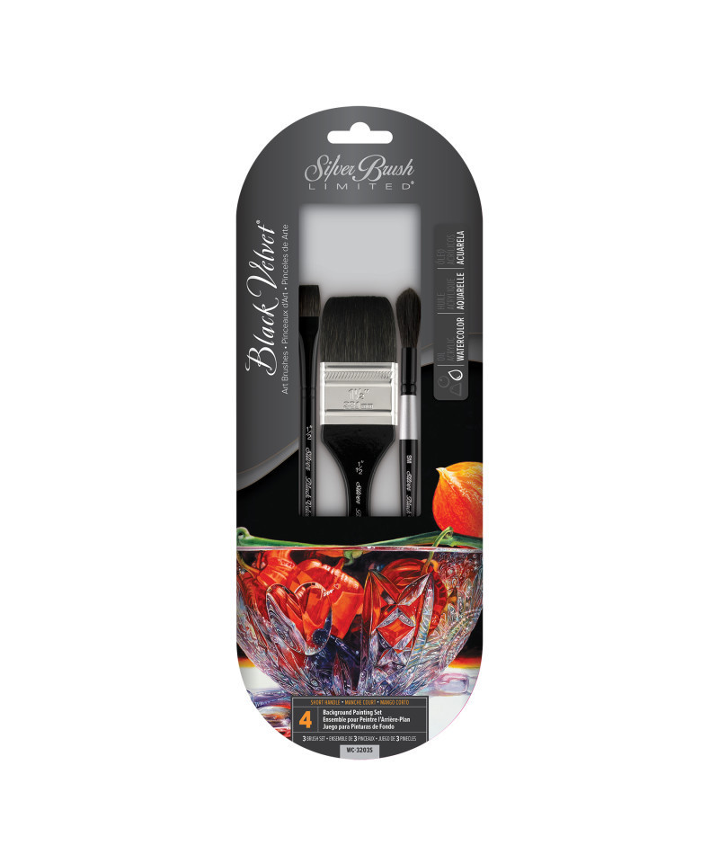 Silver Brush Black Velvet brushes were created for watercolor artists and skilled hobbyists. Each Black Velvet brush is soft enough to add color without disturbing previous layers but firm enough to lift color when needed. Silver Brush Black Velvet professional watercolor brushes are expertly crafted with a luxurious blend of squirrel hair and black synthetic fibers. Each brush has a short handle that is finished with sophisticated black lacquer. This art set comes complete with 3 brushes: a square wash, a flat wash, and a jumbo round brush. This is the perfect watercolor brush combination to apply maximum color while creating backgrounds, scrollwork, or precise details. Silver Brush Black Velvet brushes are best paired with watercolor paint. Each brush will hold the right amount of color, giving you more time to focus on your masterpiece. Watch your ethereal creations come to life with Silver Brush premium-quality brushes. Silver Brush Ltd is owned by a 4th generation art materials family and proud of Silver Brush rich heritage in bringing quality supplies to artists and craftsmen throughout the world. We delight in challenging the status quo and putting Silver Brush experience to work for you because Art is for Everyone!