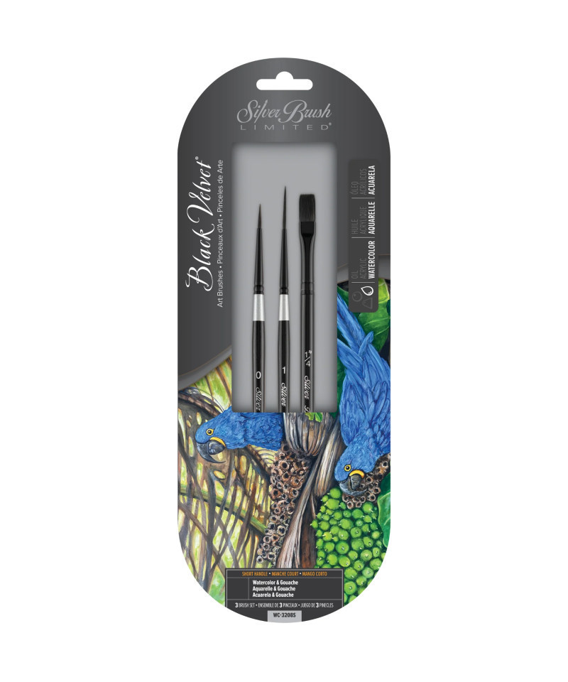 Silver Brush Black Velvet brushes were created for watercolor artists and skilled hobbyists. Each Black Velvet brush is soft enough to add color without disturbing previous layers but firm enough to lift color when needed. Silver Brush Black Velvet professional watercolor brushes are expertly crafted with a luxurious blend of squirrel hair and black synthetic fiber. Each brush has a short handle that is finished with sophisticated black lacquer. This kit includes the Black Velvet round brush size 0, Black Velvet script liner size 1 and Black Velvet square wash size 1/4. These brushes are ideal for backgrounds, line work, and scrollwork. Silver Brush Black Velvet brushes are best paired with watercolor. Each brush will hold the right amount of color, giving you more time to focus on your masterpiece. Watch your ethereal creations come to life with Silver Brush premium-quality brushes. Silver Brush Ltd is owned by a 4th generation art materials family and proud of Silver Brush rich heritage in bringing quality supplies to artists and craftsmen throughout the world. We delight in challenging the status quo and putting Silver Brush experience to work for you because Art is for Everyone!