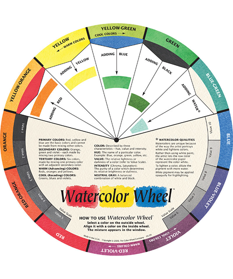 Master transparent color mixing with the Watercolor Wheel, 9-1/4" Diameter. Designed specifically for watercolor artists and students, this durable rotating chart visually demonstrates how pigments interact to create new hues and values. It clearly displays primary, secondary, and tertiary colors, along with tinting, shading, and tone relationships unique to watercolor painting. The easy-to-use format helps artists achieve balanced color harmony and consistent washes with confidence. Ideal for classrooms, studios, and workshops, the Watercolor Wheel simplifies color theory for both beginners and experienced painters. Compact yet comprehensive, it’s a valuable teaching and reference tool for developing skillful, expressive watercolor techniques in any creative setting.