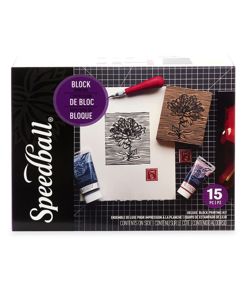 Explore the timeless art of relief printmaking with the Speedball® Deluxe Block Printing Kit, a complete set created for serious beginners and experienced artists alike. Printmaking is one of the world’s oldest and most rewarding art forms, and this deluxe kit includes everything needed to carve, ink, and print professional-quality designs. The set features both a 4 x 5 in mounted linoleum block and a 4 x 6 in Speedy-Carve® block, providing options for traditional or easy-carve materials. The included lino handle comes with five interchangeable cutting tips (#1, #2, #3, #5, and #6) and a knife for precise carving. The kit also includes four colors of Speedball® Water-Soluble Block Printing Ink: Black (2.5 oz), Red, Blue, and Yellow (1.25 oz each), plus an extender for creating transparent tones. A 4 in soft rubber pop-in brayer, dual-purpose bench hook/inking plate, and a trilingual instruction booklet (English, French, and Spanish) complete the set. Proudly made in the USA, this kit delivers reliable quality for fine art, classroom, and hobby use.
