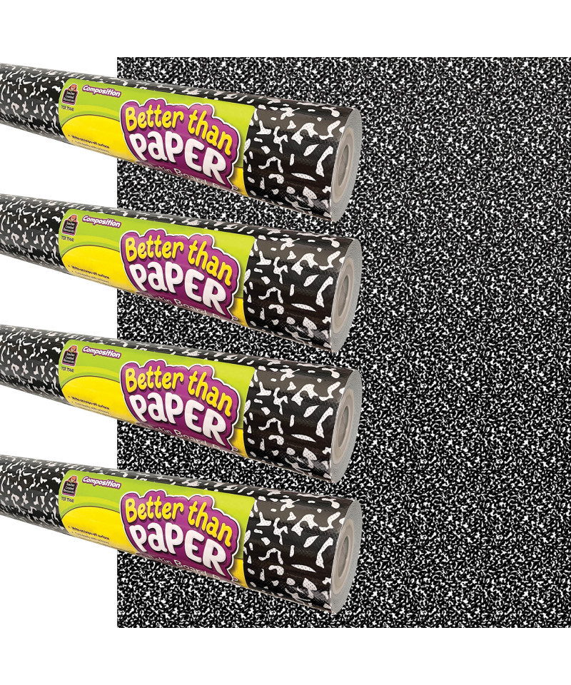 Bring a timeless classroom essential to your walls with the iconic black-and-white marbled design of a classic composition notebook. This revolutionary nonwoven fabric makes creating beautiful bulletin board backdrops quick and easy! The composition notebook design is one that everyone will recognize, and the lightweight material is simple to hang—no more struggling with paper that wrinkles and tears. Attach border trim, accents, posters and student work with staples or tape and remove without ripping or leaving conspicuous holes. Plus, the durable write & wipe surface can be used again and again! Each roll measures 4' x 12'. Sold as a pack of 4 rolls.