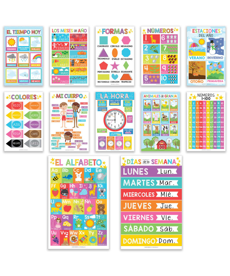 - Set children up for success in school! It's never too early for kids to learn. Grab your toddlers' and preschoolers' attention with these 11x17 inch Spanish educational posters, whether you teach in a classroom, homeschool, or just want to encourage learning