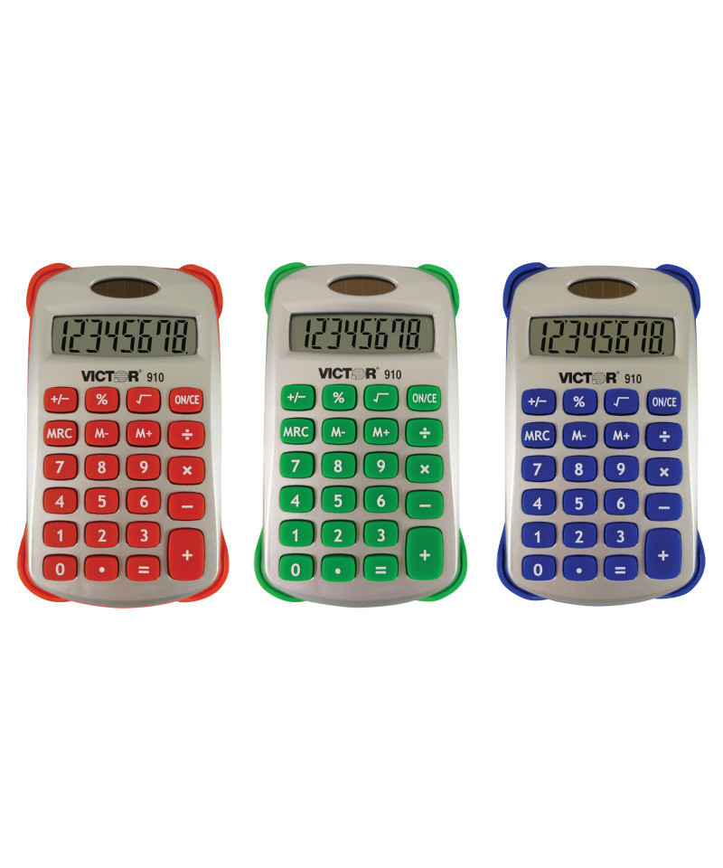 The Victor 910, 8 digit fun shaped calculator is perfect for school. Features a large LCD display. The calculator includes silver housing, uniquely-shaped rubber keys and a soft grip surround. Other functions include: 3 key independent memory, square root, change sign and percent keys. Operates on hybrid power (solar/battery backup). 2 year manufacturer's standard warranty. Assorted fun colors: red, green and blue (no color choice). Sold as a pack of 3.