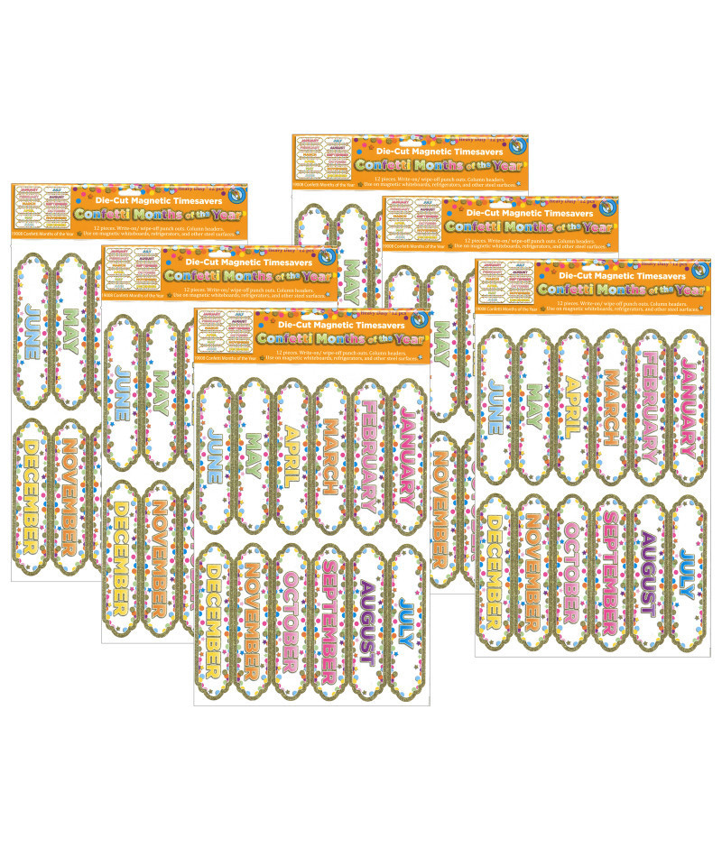 Organize your classroom or home with our magnetic column headers. Use these pre-printed timesavers for DIY calendars on magnetic surfaces. Write names, goals, assignments, and more underneath each column header. Each pack includes 12 pieces (1 per month) that easily punch out from a die-cut sheet. Sold as 6 packs for a total of 72 pieces.