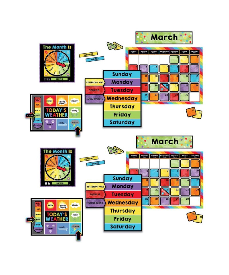 Stay on schedule and help students remember important days with this calendar bulletin board set. Each Celebrate Learning Calendar set includes these 86 pieces: 1 calendar (23" x 17"), 12 monthly headers (17" x 4"), 41 cover-ups (2.75" x 2.5"), 17 special occasion cover-ups (2.75" x 2.5"), 1 days-of-the-week chart with 3 arrows (11.5" x 17"), 1 months-of-the-year chart with arrow (11.5" x 12.5"), 5 season overlays (5.5" x 1"), and 1 weather chart with 3 arrows (15.75" x 11.25"). This set helps students keep up with dates, weather, and more! Sold as 2 calendar sets.