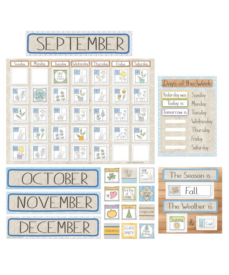 Bulletin Board Sets are a great way to add creativity to bulletin boards, hallways, walls and classroom space with fun designs and themes. Each 107 piece set includes 5 panels with: 1 Giant Calendar (17" x 24"), 12 Month Headings, 33 Dates, 37 Special Days, 1 Days of the Week Chart with Today Is, Yesterday Was, and Tomorrow Is Indicators, and 1 Seasonal Chart with Various Weather and Temperature Indicators. Printed on heavy weight card stock. Full color illustration. Reusable and easy to punch out design. Coordinates with A Close-Knit Class collection.