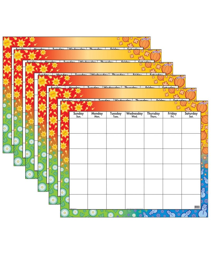 Keep up with changing plans! This reusable calendar offers a convenient way to stay on track. Writes easy, wipes clean with a tissue. Use again and again. Great for homes, offices, classrooms, childcare centers, and more. Measures 22" x 28". Sold as a pack of 6 charts.