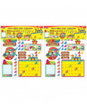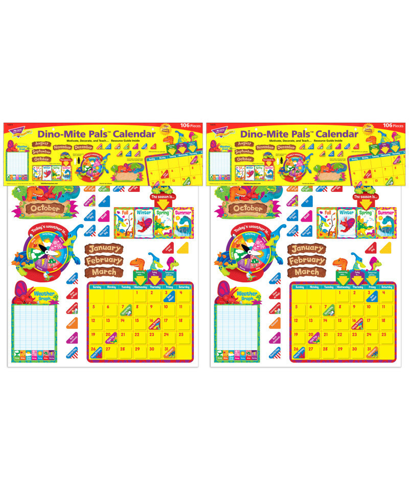 Kids will have a Dino-mite time learning calendar concepts! Dino-Mite Pals help students trach months, special dates, seasons, and the weather. Includes a 17 1/2" x 23" calendar, weather graph, weather wheel, seasons card with slider, 33 numbers, 12 month headers, 44 special days, blank header, and Yesterday, Today, Tomorrow sliders. 100 pieces. Coordinates with Dino-Mite Pals Collection. Sold as 2 sets.