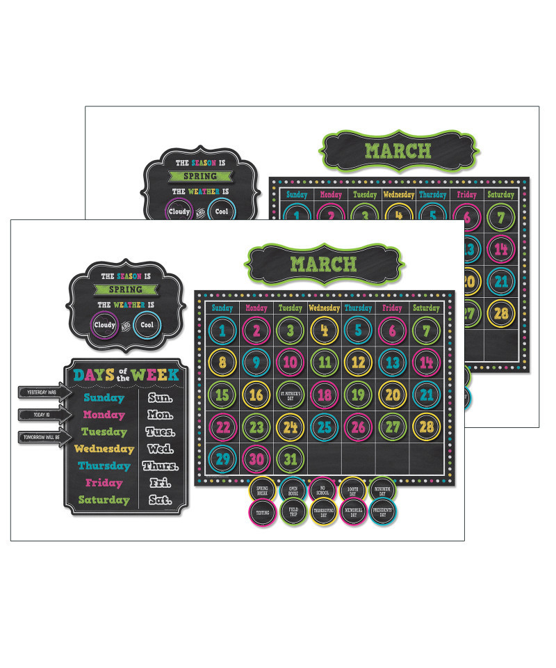 This stylish calendar display comes with easy-to-read number pieces, colorful monthly headers, and additional pieces for holidays and special occasions as well as yesterday, today, and tomorrow. Blank calendar measures 24" x 18". 84 pieces per set. Sold as 2 calendar sets.