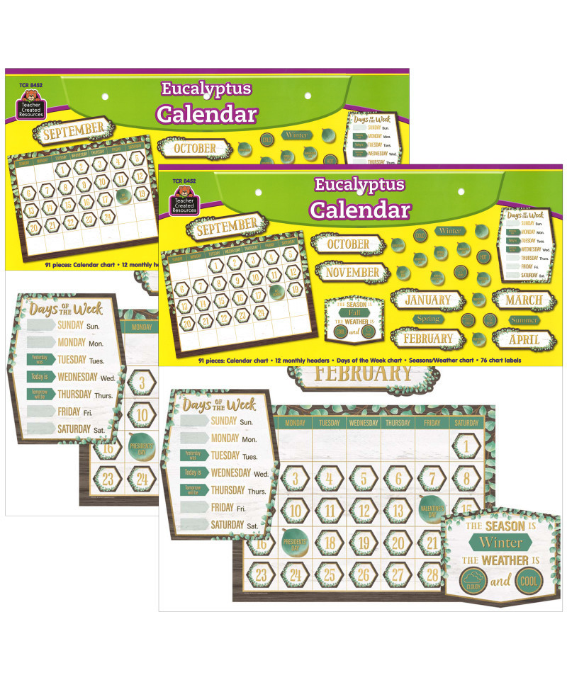 This wood and nature-inspired calendar display comes with easy-to-read number pieces, colorful monthly headers, and additional pieces for holidays and special occasions as well as pieces for yesterday, today, and tomorrow. Blank calendar measures 24" x 18". Each set includes 91 total pieces. Sold as 2 sets for a total of 182 pieces.
