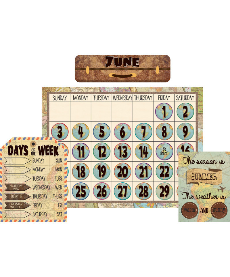 This travel-inspired calendar display comes with easy-to-read number pieces, colorful monthly headers, and additional pieces for holidays and special occasions as well as pieces for yesterday, today, and tomorrow. Blank calendar measures 24" x 18". 84 total pieces.