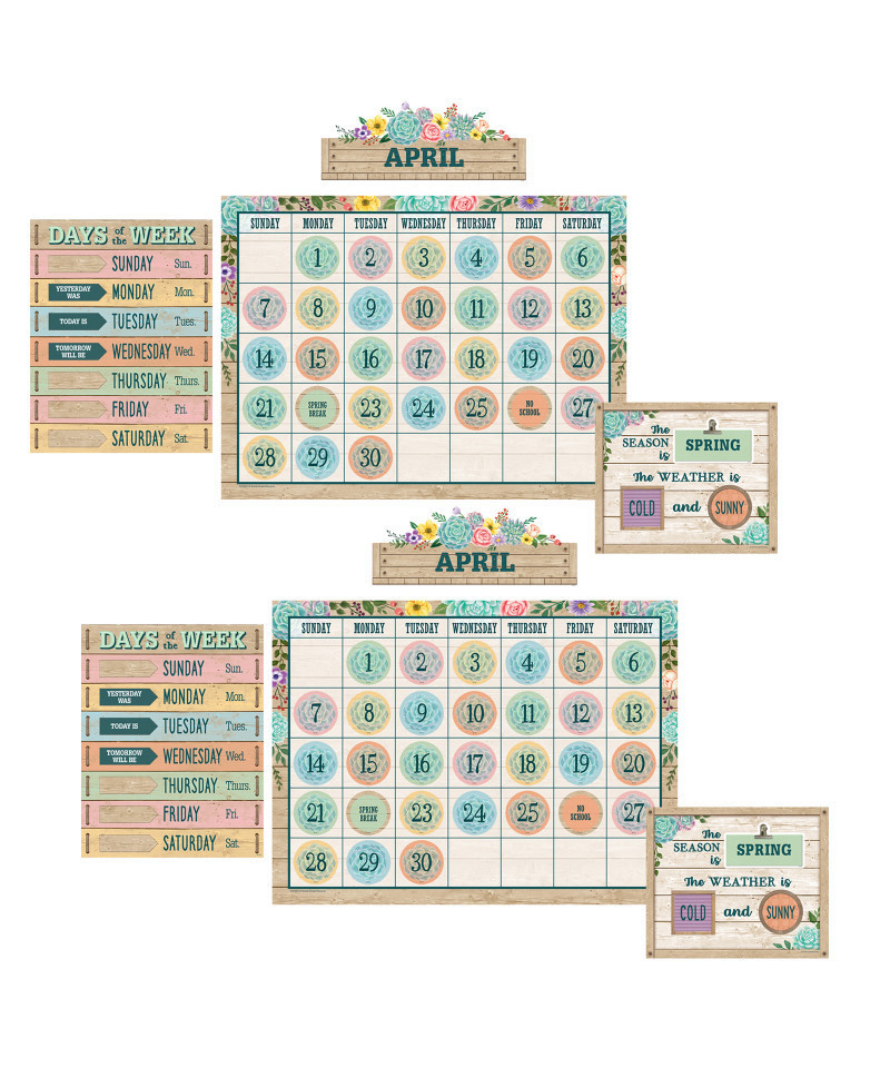 This garden-inspired calendar display comes with easy-to-read number pieces, colorful monthly headers, and additional pieces for holidays and special occasions as well as yesterday, today, and tomorrow. Blank calendar measures 24" x 18". 85 pieces per set. Sold as a pack of 2 complete sets.