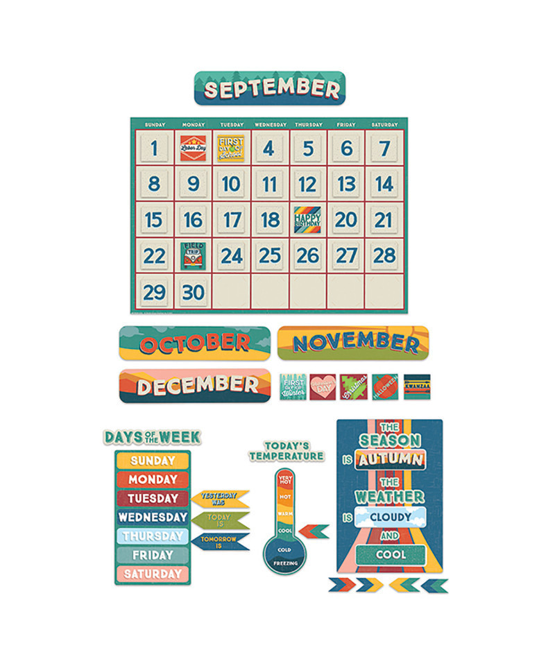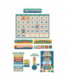 Eureka Bulletin Board Sets are a great way to add creativity to bulletin boards, hallways, walls and classroom space with fun designs and themes. Each set includes 110 pieces packaged as 5 panels: 1 Giant Calendar (17" x 24"), 12 Month Headings, 33 Dates, 37 Special Days, 1 Days of the Week Chart with Today Is, Yesterday Was, and Tomorrow Is Indicators, 1 Seasonal Chart with Various Weather Indicators, and 1 Temperature Indicator with Header and Arrow Indicators.