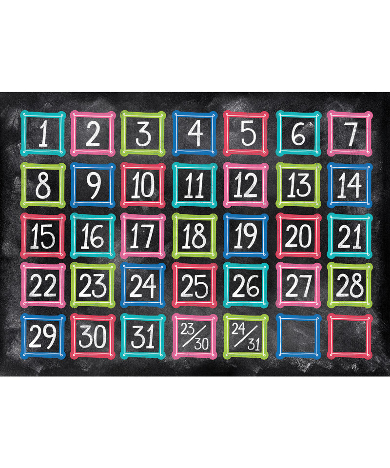 Brighten each day of the month with the colorfully trimmed Colorful Chalk Calendar Days! These versatile cut-outs are designed to look great on any calendar chart. Each pack includes 35 pieces: 31 number days, 2 combined number days (23/30 and 24/31), and 2 blank days for highlighting special events or holidays and recognizing birthdays. Calendar Days are great for use on a classroom calendar during the daily calendar lesson or circle time. They can also be used as student numbers to label cubbies, folders, desks, and more!