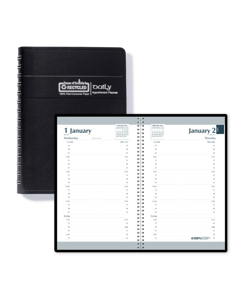 The House of Doolittle Daily Planner has one page per weekday, Quarter-hour appointments 7:00am to 7:45PM. Includes Julian dates and days remaining. Includes double-sided storage pocket. Printed monthly indicators to make it easy to find the correct month. Black embossed, simulated leather cover. Spiral bound with 90% recycled double wire binding. Printed on 100% post-consumer recycled paper. Made in the USA.