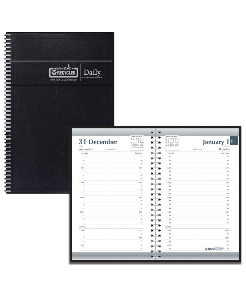 The House of Doolittle Daily Planner has one page per weekday, Quarter-hour appointments 7:00am to 7:45PM. Includes Julian dates and days remaining. Includes double-sided storage pocket. Printed monthly indicators to make it easy to find the correct month. Black embossed, simulated leather cover. Spiral bound with 90% recycled double wire binding. Printed on 100% post-consumer recycled paper. Made in the USA.