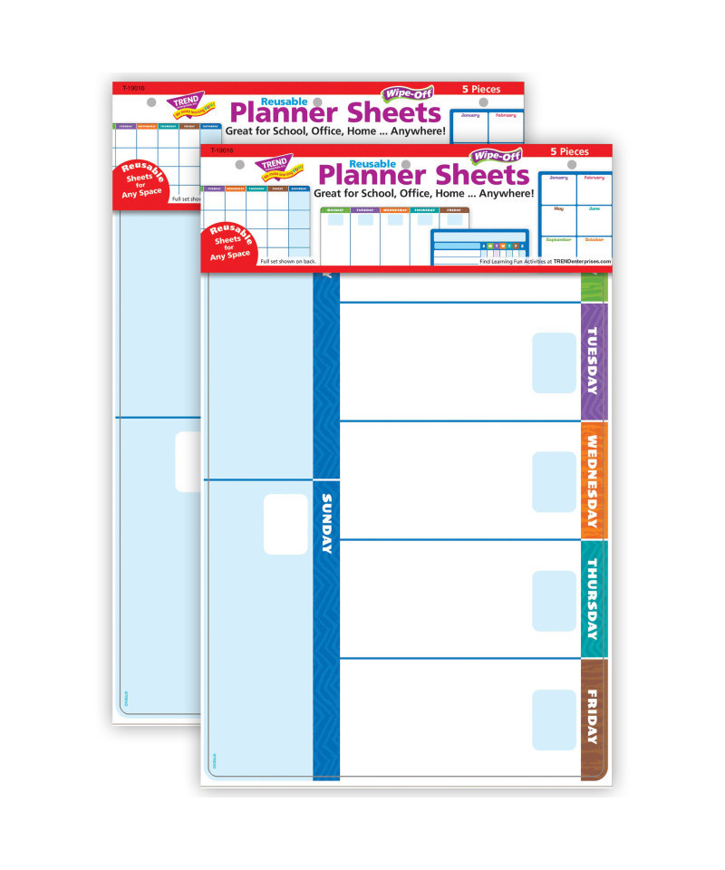 Change of plans? TREND's Wipe-Off® Planner Sheets Learning Set has you covered! Reusable weekly, monthly, and 12-month undated calendars offer a convenient way to organize schedules and stay on track. Two reusable project sheets give visibility to progress on scheduled task assignments and chores. Surfaces are specially coated to write on and wipe clean easily with a dry-erase marker - use again and again in classrooms, offices, homes, community centers, and more. Sized right for placement on refrigerators, cabinets, and doors - wherever you need a bit of space. Printed on durable, heavier-weight paper and packaged in an easy-seal reusable bag for storage. Made in the USA. Each set includes 5 reusable sheets, up to 10-3/4 inches x 16-1/8 inches. Sold as 2 complete sets for a total of 10 sheets.