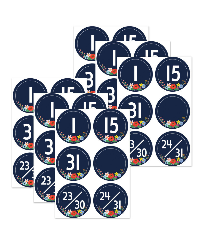 Use these calendar days to turn our calendar charts into reusable calendars month after month! Great for any daycare or classroom setting. Each pack includes 36 (2-1/2" x 2-1/2") pieces: 1-31, 23/30, 24/31, and 3 blank cards. Sold as 6 packs for a total of 216 pieces.