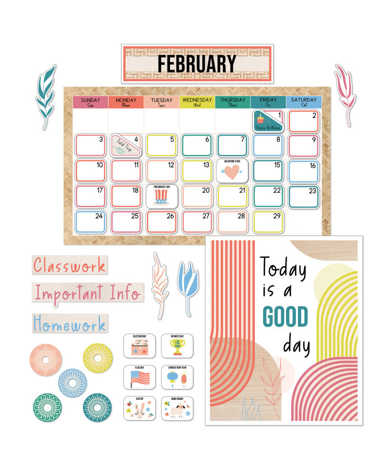 Reinforce calendar skills in a hands-on way using Carson Dellosa's True To You Monthly Calendar Bulletin Board Set! The 137-piece set includes a 22.5" x 13.3" classroom calendar with monthly headers and number, special occasion, holiday, and blank cover ups to showcase special dates each month. Decorate your wall calendar with the included leaf and medallion accents for an extra sense of style—but that's not all! Classroom management is made easier with Important Info, Homework, and Classwork headers to help organize important schoolwork with ease.