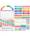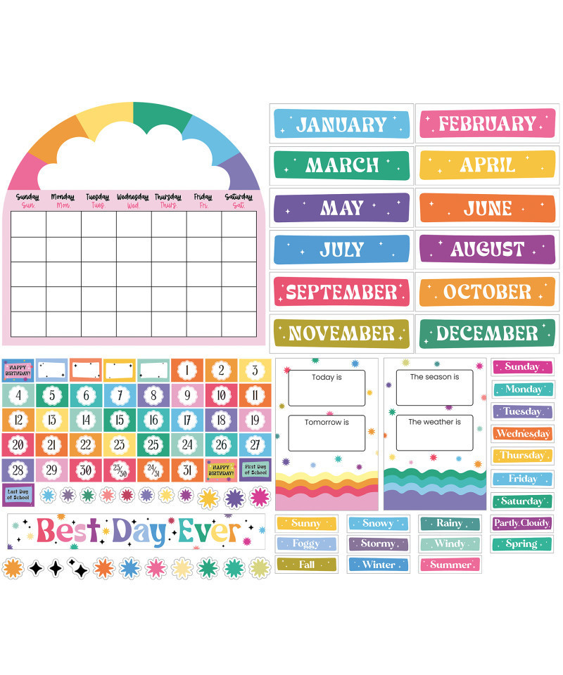 Add some retro vibes to your homeschool or classroom monthly calendar displays with the Happily Ever Elementary Retro Remix Calendar Bulletin Board Set! The 107-piece set includes a 22" x 3" banner, a 22.5" x 20.8" monthly calendar (assembled from 2 pieces), monthly headers, 8.75" x 13" seasons/weather and days of the week chart with 5.37" x 1.5" seasons and weather cards. The wall calendar set also includes number, special occasion, and blank cover ups (2.75" x 2"), as well as twinkle and starburst retro decor. This vintage wall calendar set helps reinforce schedules, important dates and holidays, days of the week, seasons, weather, and more essential skills and is the perfect size for bulletin board, cork board, white board, and other wall displays. Retro Remix, designed by Stephanie and Loreal of @HappilyEverElementary, partnered with Carson Dellosa to bring some fun, retro vibes to your learning environment.