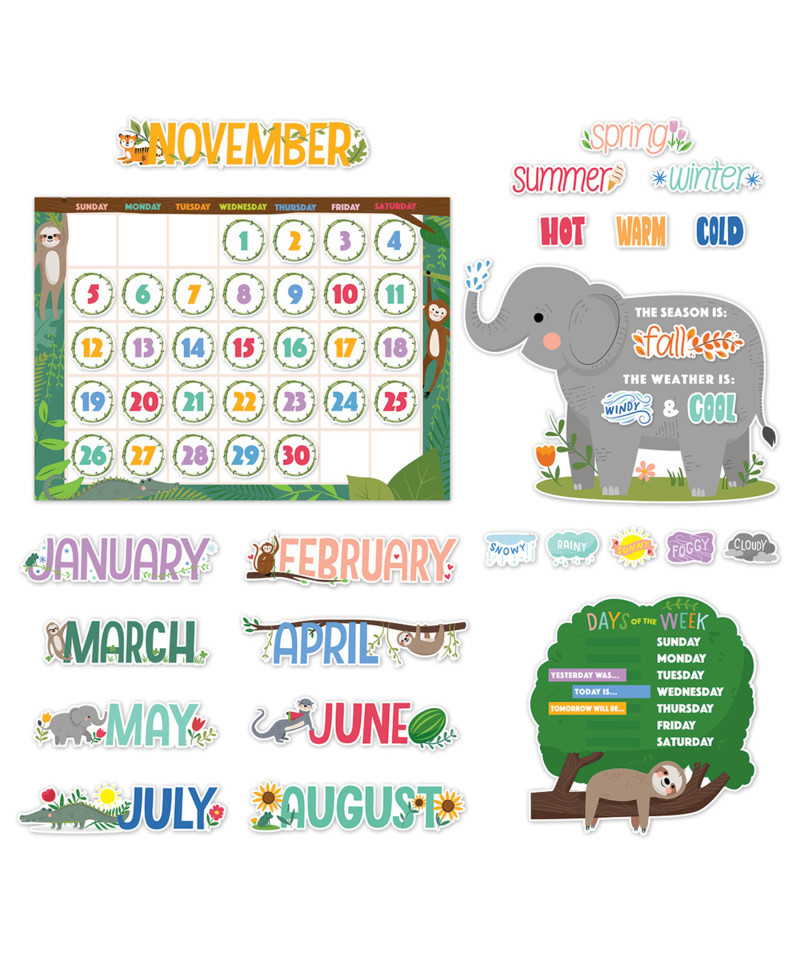 This colorful Jungle Friends Calendar Set features favorite jungle-dwelling creatures along with accents symbolic of each month. Use the moveable pieces to teach calendar concepts, display the month of the year, the days of the week, and record the changing seasons and daily weather conditions.