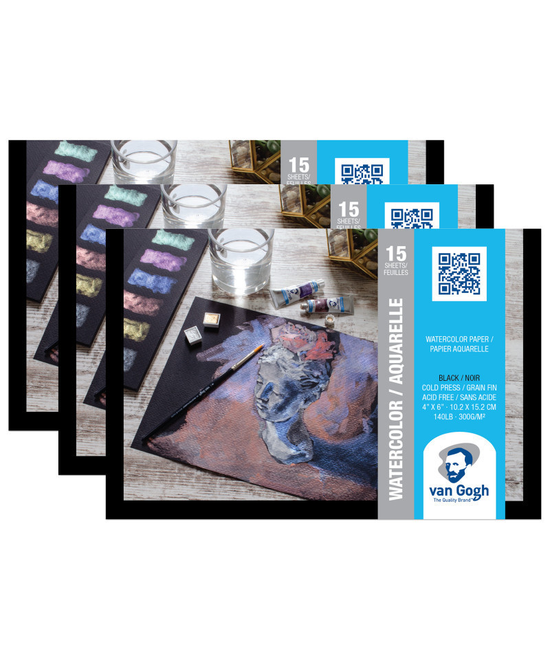 Van Gogh Watercolor Paper Pad, 140lbs, Black, Cold Press, 4" x 6", 15 Sheets, Pack of 3