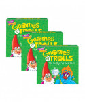 Gnomes vs Trolls card game has lots of sneaky fun to treasure! Enjoy a delightful mix of beginner strategy and unsuspecting surprises with this loveable family card game. Gather the most treasure and save it from the tricky trolls to win! Tricky trolls are lurking, turning up when they're least expected. Flip a card to find your fate: a gnome, treasure, or a TROLL! Nine thieving trolls surprise unsuspecting gnomes, take their treasure, and put an end to their gathering games. It's up to players to surround their treasure cards with gnomes to protect it, but remember, when the 9th troll card turns up, time's up! Unique, three-sided cards with storybook illustrations give players lots of fun surprises to spot. The inventive pyramid "troll timer" creates suspense – no two rounds of the game play the same way! Quick setup and play makes Gnomes vs Trolls card game perfect for birthdays, parties, gatherings, and family game nights too. Each game includes 63 cards plus full-color instructions included. 30-minute play time. 2-4 players, ages 4 to adult. Made in USA. Sold as a pack of 3 identical card games.