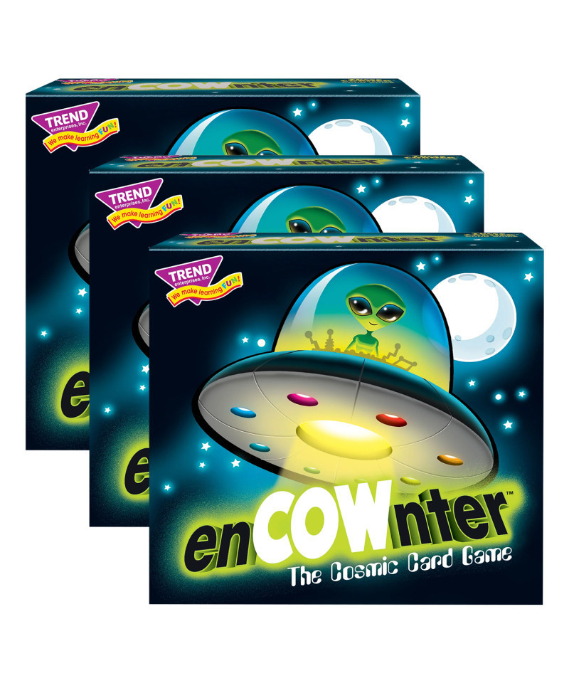 Greetings, fellow aliens. It's time for some chance enCOWnters! Leave your opponents in the cosmic dust by quickly capturing earthly things to complete a mission first. Avoid Martian Mayhem and carefully choose which cards to keep and which to send into orbit. Every turn leaves a chance for drawing mission-changing cards that cause cosmic chaos! Unique, three-sided game cards fit together to fill light beams full of unsuspecting earthly things - their expressions bring humor to adults and kids alike! Compact box and minimal play area required makes this card game perfect for grab-and-go fun. Bring entertainment during travel, in waiting rooms, at sleepovers, to grandparents' houses and camps. Minimal room required: Play area fits on RV and coffee tables, airplane seat trays, and more. Each game includes 63 game cards, plus full-color instructions. 2 to 4 players, ages 6 to adult. 15-minute game play means there's always time for one more enCOWnter! Made in USA. Sold as a pack of 3 identical card games.