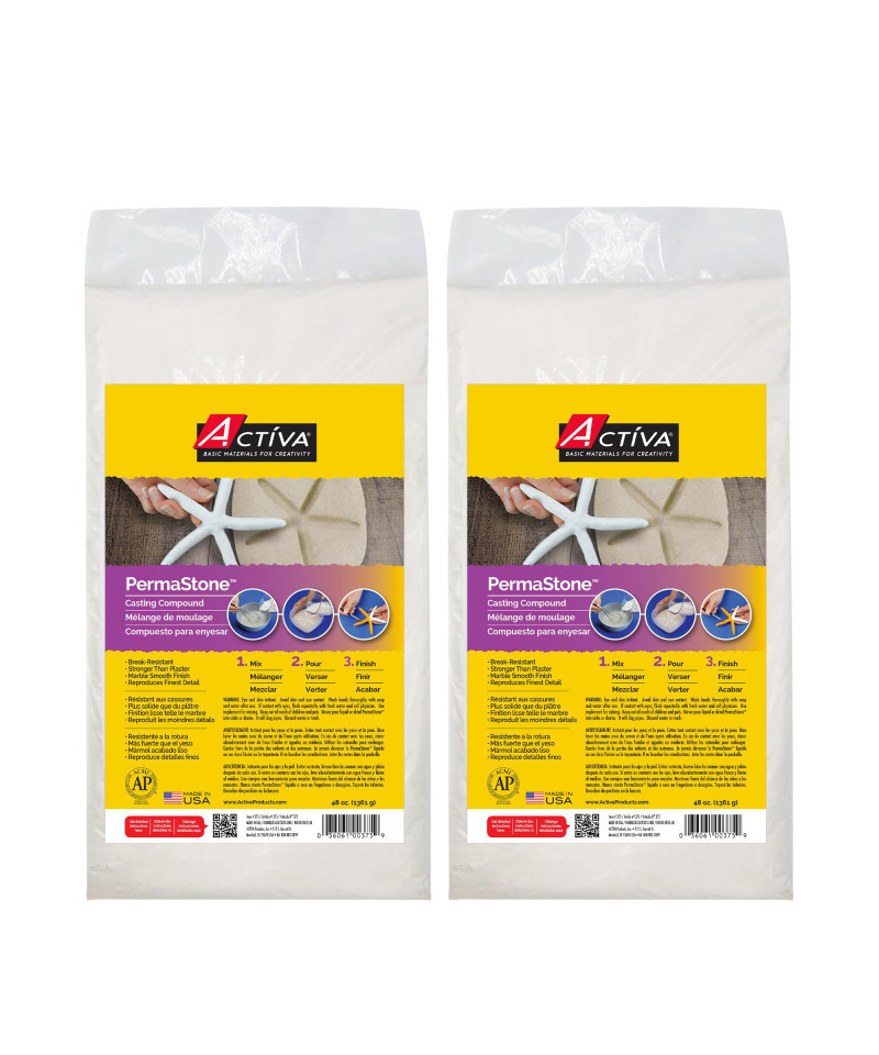 PermaStone is the ideal casting compound when permanent, break-resistant castings are desired. It handles like plaster and has a stone-like finish. ACTÍVA PermaStone mixes easily with water and reproduces the finest detail. If it happens to break the fracture is clean and easily glued/fixed. As it dries white, it can be painted with acrylics, oils, watercolors, tempera or any other finish! PermaStone is microwavable, non-toxic, and water resistant. Each bag includes 48 oz. of PermaStone. Sold as 2 bags.