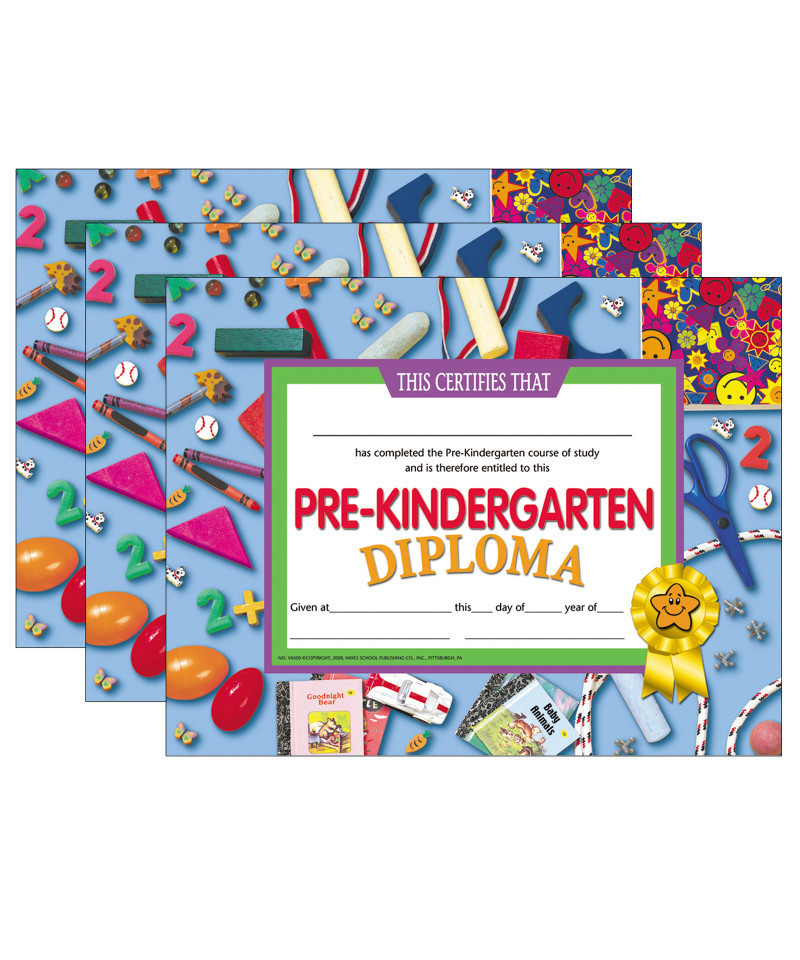 Diploma reads: This Certifies That _____ has completed the Pre-Kindergarten course of study and is therefore entitled to this Pre-Kindergarten Diploma Given at _____ this _____ day of _____ year of _____.