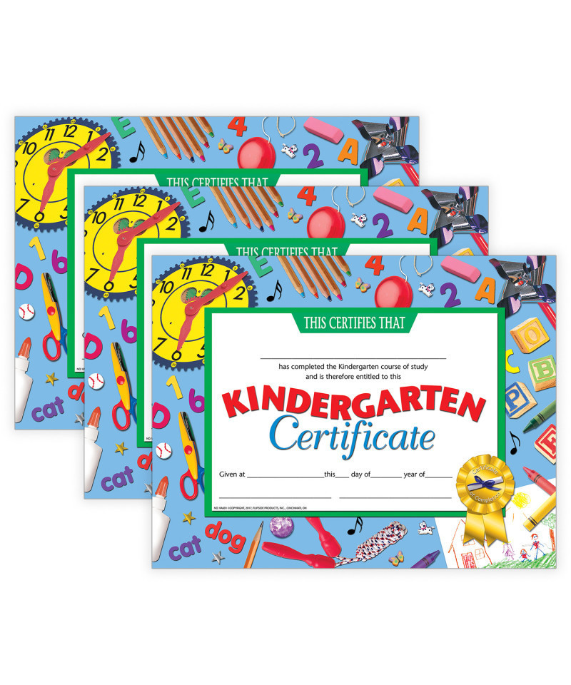 Certificate reads: This Certifies That _____ has completed the Kindergarten course of study and is therefore entitled to this Kindergarten Certificate Given at _____ this _____ day of _____ year of _____. These certificates can be handwritten or printed by using a downloadable template.