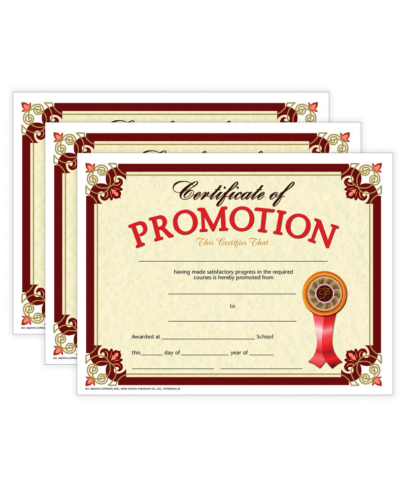 Certificate reads: Certificate of Promotion This certifies that _____ having made satisfactory progress in the required course is hereby promoted from _____ to _____. Awarded at _____ School this _____ day of _____ year of _____.