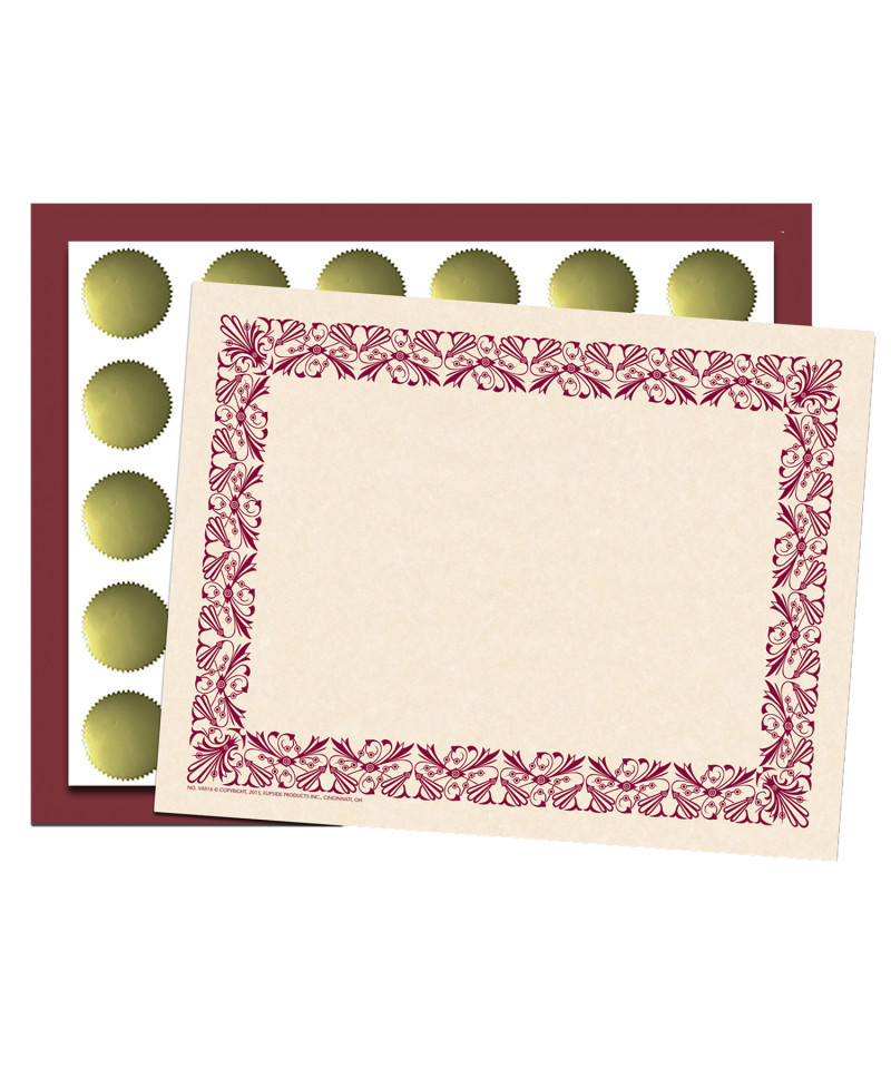 Art Deco Maroon Border Paper Set is great for a variety of certificates and awards! This set includes 50 sheets of border paper, 30 matching folders, and 30 gold foil seals. Your message can be either printed or written on the border paper.