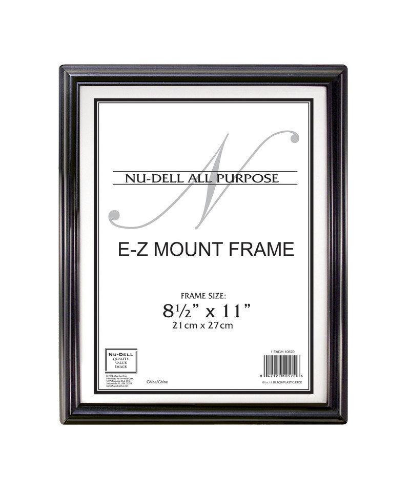 Nudell e-z mount quick insert frames are the ideal professional solution for documents, photos, diplomas, certifications and more. Hang on walls and mount with ease. Simple slide-in allows documents to be installed with no tools or folding tabs. Clear plastic face keeps documents protected and visible. Black plastic frame with accents provide a classic and professional way to showcase accomplishments in any office, classroom, or home workspace.