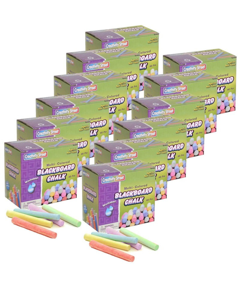 Blackboard chalk that is great for teachers during classroom instruction, and also for students on chalk lapboards during individual and group work. All chalk is 3/8" diameter and 3-1/4" in length. Each pack includes 60 pieces of non-toxic, washable blackboard chalk in assorted colors. Sold as 12 packs for a total of 720 pieces.