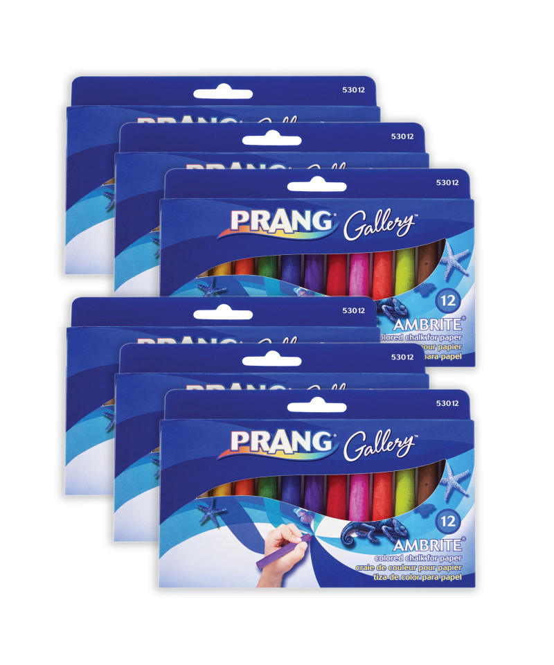 Assorted colors blend and burnish easily. Drawing paper or other toothed papers give best results. Chalk can be flaked into water for brilliant unique paper marbling effects. Draw bold colors on wet paper for other unique effects. Use with Prang Fixative. Stick size: 3-3/16" x 7/16". AP certified non-toxic. Each pack includes 12 pieces. Sold as 6 packs for a total of 72 pieces.
