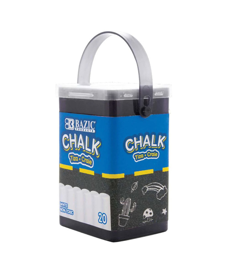A fun little bucket of white color chalk! The bucket gives better protection for the chalks, keeping them organized, cute yet functional. Each standard chalk size measures 3 1/4" long by 3/8" inch in diameter. Comes in a bucket with handle so kids can take fun outdoors. Non-toxic, smooth & clean writing. Suitable for all ages to enjoy creating artistic and drawings activity. Marks smooth and erases easily from black board or chalk boards. Can be used on multiple surfaces like blackboard, chalkboard, craft papers, and paper bags. Low dust special formula creates a dustless drawing experience. Safe for use indoor. Visible on dark or colored surfaces. Create big, colorful murals or write large handwritten messages in vivid shades. Bucket of 20 pieces of chalk.