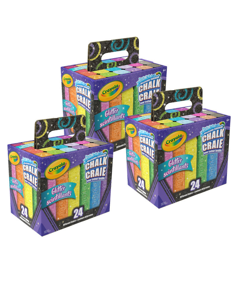 - MULTI-PACK: Each set includes 24 dazzling Glitter Chalk sticks in bright and bold colors, each with its own special glitter effect. Sold as 3 packs for a total of 72 chalk sticks.