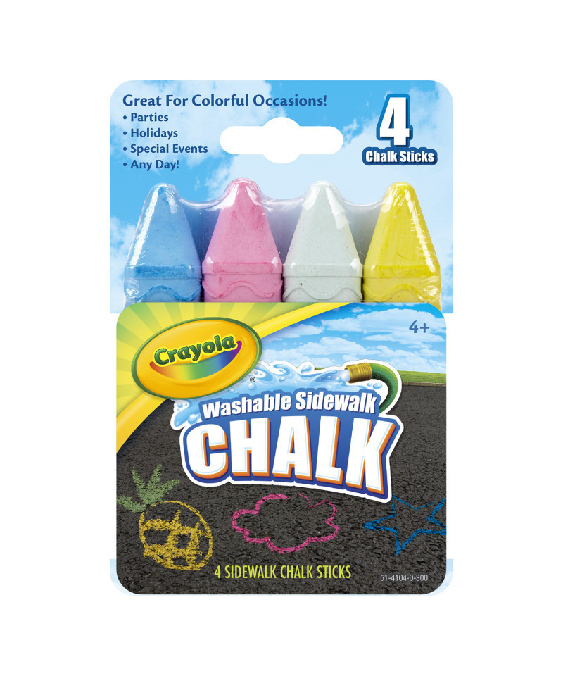 Crayola Washable Sidewalk Chalk sticks are the perfect art tools to create BIG outdoor art with a select color assortment for your special occasions—parties, holidays, special events and more! It's everything you need to decorate the day for a sidewalk celebration! Includes 4 sidewalk chalk sticks in popular colors for any occasion. Washable Sidewalk Chalk washes away with a garden hose or the next rainfall.