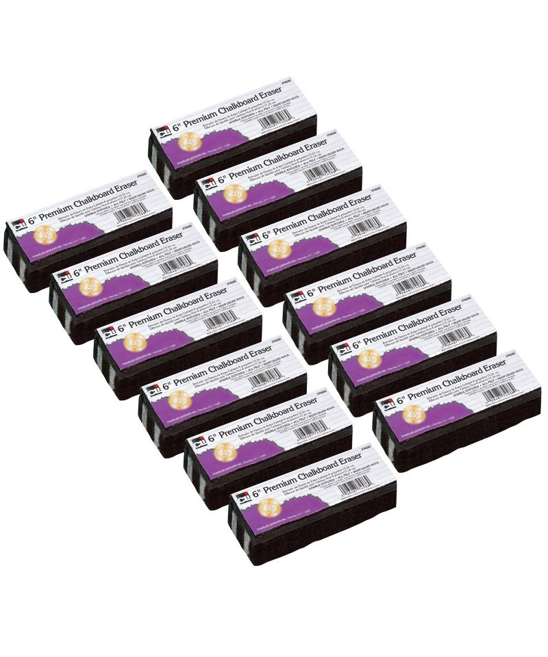 Black and white erasing felts are double lock-stitched to a reinforced backing. Large felt strips provide better cleaning and longevity. 0.13" felt is laminated to the body for additional comfort. Measures 6" x 2" x 1.31". Pack of 12 erasers.