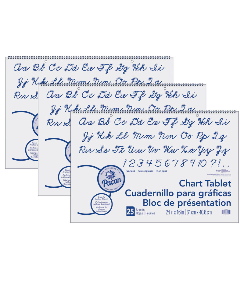 This Chart Tablet features White sulphite bond paper that is spiral bound to stiff covers. It is 2-hole punched for easy hanging. The unruled paper works well for classroom anchor charts, posters and other teaching aids. Measures 24" x 16". Each tablet includes 25 sheets. Sold as a pack of 3 tablets.