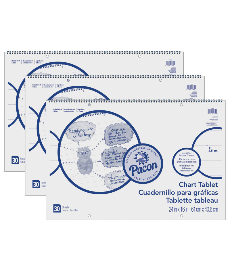 This Chart Tablet features White sulphite bond paper that is spiral bound to stiff covers with a Cursive alphabet printed inside. It is 2-hole punched for easy hanging. Paper is 1" ruled on both sides, and works well for classroom anchor charts, posters and other teaching aids. Measures 24" x 16". Each tablet includes 30 sheets. Sold as a pack of 3 tablets.