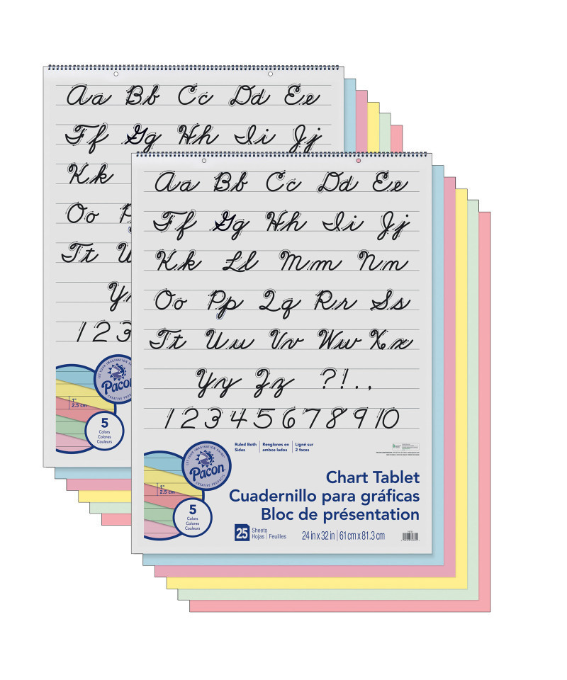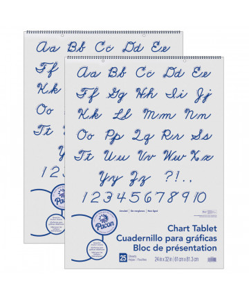 Traditional chart tablets made with pastel colored bond paper. Each tablet contains assorted colors: Yellow, Pink, Salmon, Blue and Green. Sheets 1" ruled the short way, spiral bound and 2-hole punched. Inside front cover features a Cursive alphabet. Recycled and Recyclable. Measures 24" x 32". Each tablet includes 25 sheets. Sold as a pack of 2 tablets.