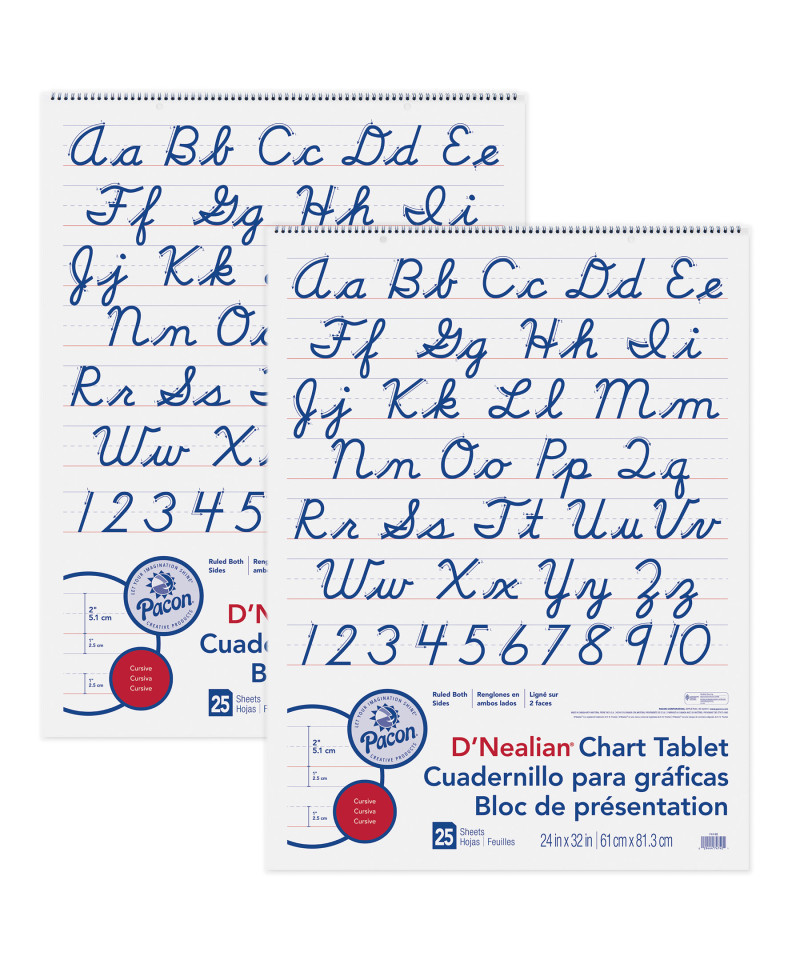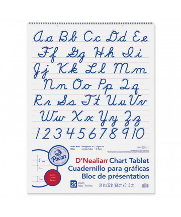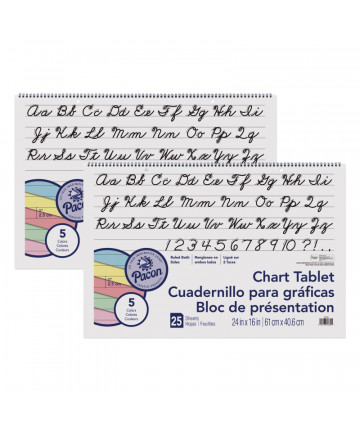 This Chart Tablet is 2" ruled on both sides with solid blue headlines, dotted blue midlines and solid red baselines. The outside cover shows the cursive alphabet and numerals, with directional arrows for classroom demonstration. The inside cover shows the alphabet and numerals for modeling when writing in the tablet. White sulphite bond paper sheets are spiral bound and 2-hole punched. Ruled the short way. Recyclable. Measures 24" x 32". Includes 25 sheets. Sold as a pack of 2 tablets.