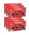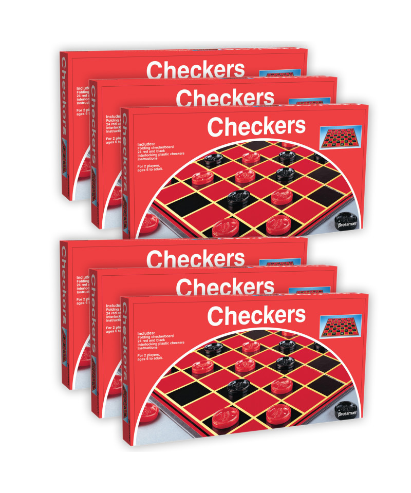 The all-time favorite! Includes folding game board, solid interlocking plastic checkers and rules. For 2 players, ages 6 to adult. THE OBJECT OF THE GAME: To capture all of the opponent's men, or block them so they cannot be moved. The checkers are moved diagonally and each player moves alternately one of his men, in order to 'capture' an opponent's checker, he must be able to jump (with his own man) over his opponent's checker when there is a vacant square behind. Single men may move diagonally forward. When a checker has reached the last row of his opponent's side, it becomes 'King' and then may move diagonally forward or backward. The 'King' is 'crowned' by placing another checker on top of it. Sold as a pack of 6 identical games.