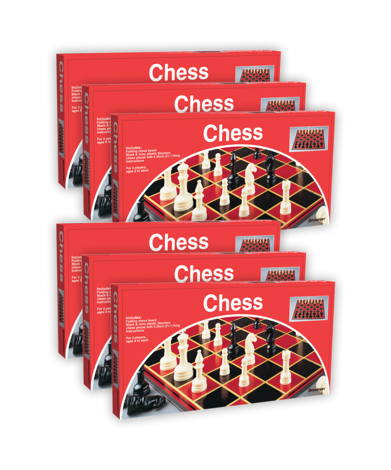This is the perfect chess set to add to your family game collection. Includes folding chess board, full-sized plastic Staunton chess figures with 2.5" King and rules. For 2 players, ages 8 to adult. Sold as a pack of 6 identical games.