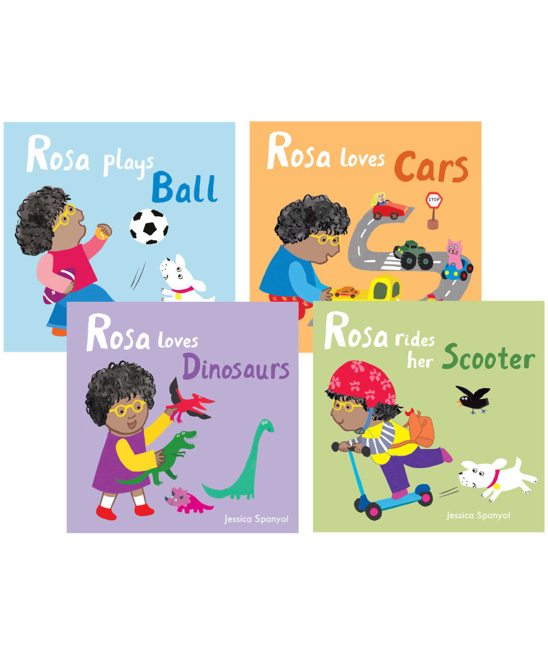Let's find out what Rosa and her friends are playing with today! An important board book series that celebrates inclusivity, promotes gender equality and embraces the uniqueness of every child. 14 pages per book. Set includes 4 board book titles: Rosa Rides Her Scooter, Rosa Loves Dinosaurs, Rosa Loves Cars, and Rosa Plays Ball.